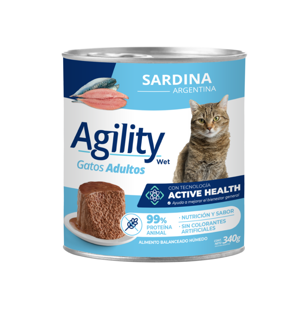 Alimento húmedo 100 % completo y balanceado para gatos con sardina argentina. Alimento balanceado completo húmedo, cocido al vapor, resultado de una mezcla equilibrada de macronutrientes, micronutrientes y aditivos de la más alta calidad que cubren los requerimientos alimenticios de los gatos (desde 1 año en adelante) con actividad normal.