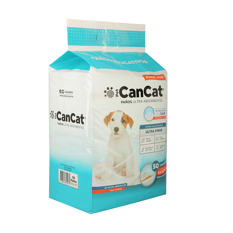 Los paños sanitarios CANCAT son un producto diseñado para ayudar en el entrenamiento de higiene canino, especialmente cachorros o perros mayores que puedan tener dificultades para controlar sus necesidades. Este paño está hecho con materiales resistentes al agua, cuenta con una tecnología SAP que trae un sistema de 5 capas super absorbentes que evitan que los líquidos traspasen.