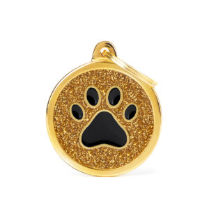 Deja que tu mascota robe el espectáculo a todos con la Placa Shine Círculo grande Purpurina oro Hueso Negra. Este accesorio se convertirá en un must para los amantes de las mascotas más fashionistas. Realizada en cada detalle en nuestra manufactura en Italia, está esmaltada a mano. Personalizable en la parte trasera con un grabado fácilmente legible y duradero. Equipada con un práctico anillito para engancharla al Porta-Placa.