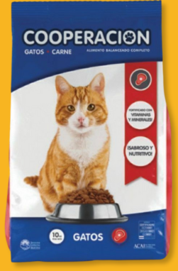 Alimento balanceado para gatos adultos de la marca Cooperación. Presentación de 10 kgs con 30% de proteinas. Sabor carne