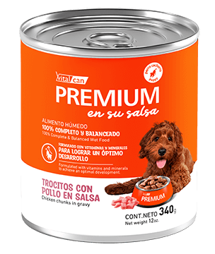 Carne de pollo, agua de manantial, hígado porcino, faringe vacuna, pulmón porcino, harina de arvejas, aceite de pollo, sal, lisina, metionina, levadura, pulpa de remolacha, cloruro de potasio, carragenina, goma guar, tripolifosfato de sodio. Vitaminas: A, D3, E, B1, B2, B6, B12, K3, biotina, colina, ácido fólico, ácido nicotínico, ácido pantoténico. Minerales: zinc, hierro, cobre, manganeso, yodo y selenio.