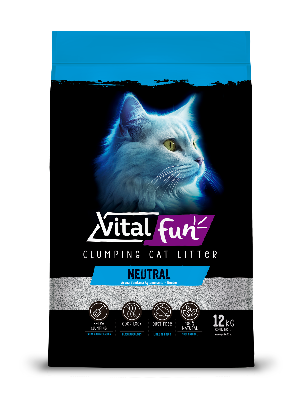 - EXTRA AGLOMERACIÓN. Vitalfun Clumping Litter Neutral, es bentonita natural desarrollada mediante una molienda especial que potencia la aglomeración al contacto con la orina y las heces del gato formando grumos sólidos que son fáciles de retirar.